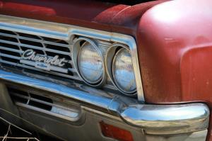 Sitting in a junkyard this red Chevy proudly wears it's emblem.