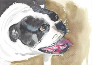 This cute black and white bull dog is wanting something! A treat or to go outside or just to play ball? It's anyone's guess. Do we ever really know what a bull dog is thinking?