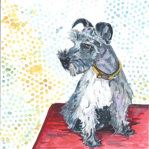 If I pose like this will I get someone's attention and find a home? Of course!! This Schnauzer was sitting in a wicker chair and I liked the way the light came through the holes of the chair so I tried to recreate that light with watercolor and I love it! I will use this technique again in the future! This original painting is sold but please find a print you will enjoy hanging in your home or office.