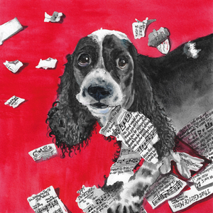 A cute little black and white cocker spaniel chews up some music sheets, which say exactly what every friend needs to hear.