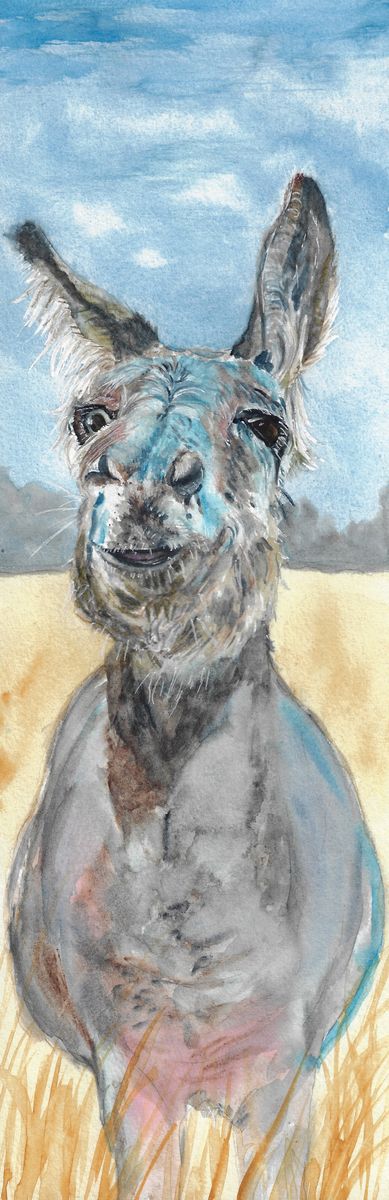 This donkey lives next door to my Uncle Bob in a field in Kansas. He seemed to say Hey Y'all over and over after smiling big for the camera. This watercolor then made it's way to a wine label here in Missouri, making him a famous donkey. The original art was created on 5"x15" paper. You can also find a "flipped" version which looks really great hanging with this one side by side.