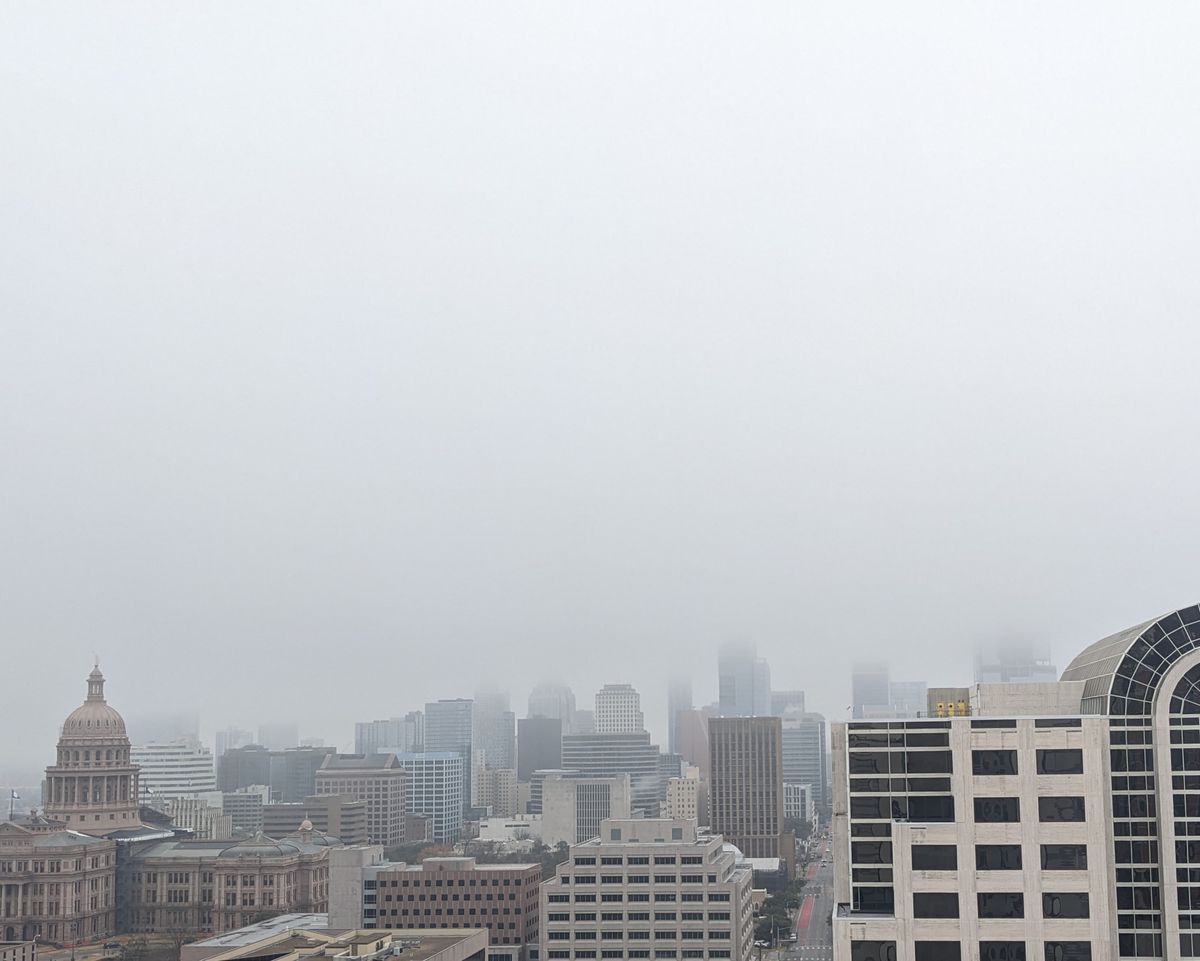 A cityscape of downtown Austin, Texas as a dense fog descends upon the city.