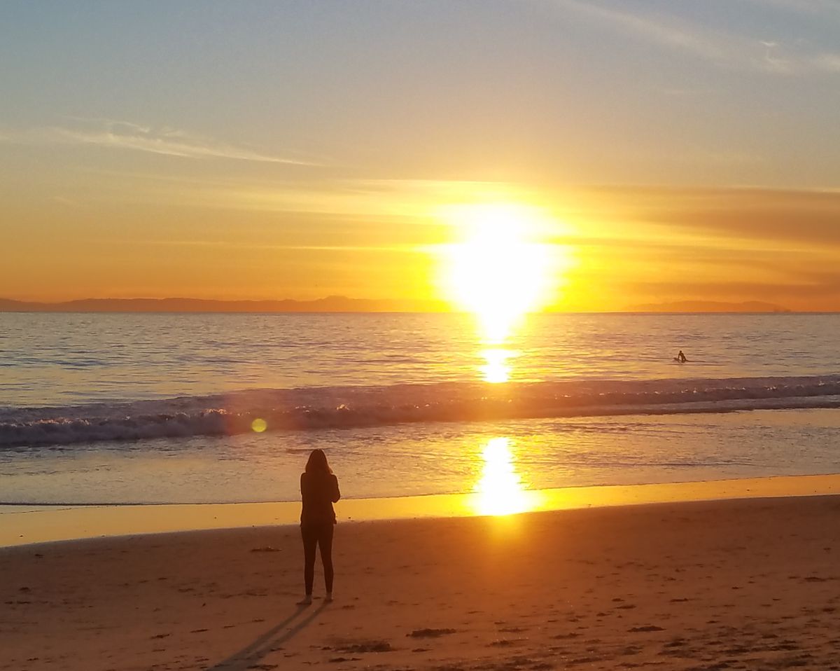 A person standing on the shore looking into the sunset over the ocean as a lone surfer floats in the water.