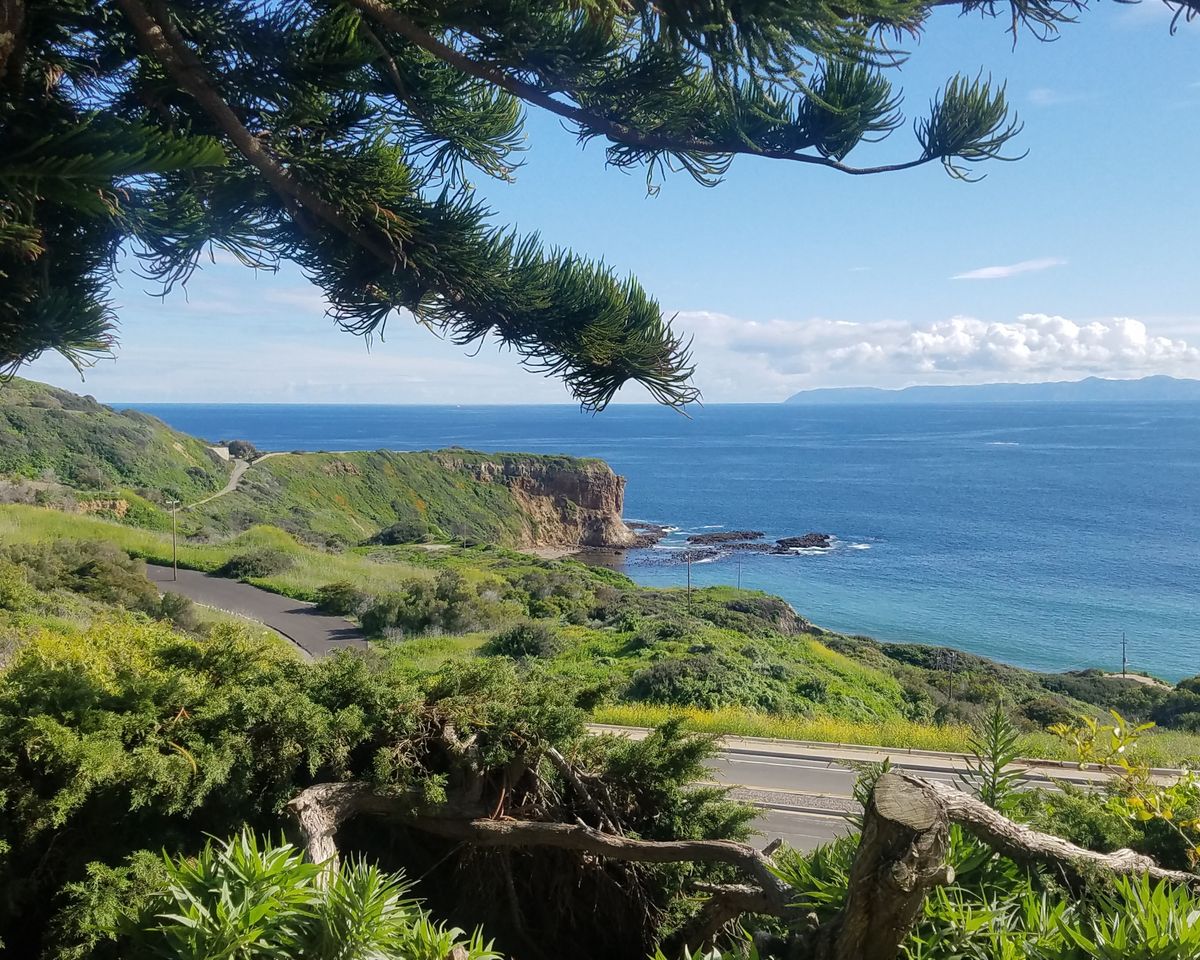 A road running along the coast in front of cliffs by the ocean and Catalina Island in the distance under fluffy clouds.