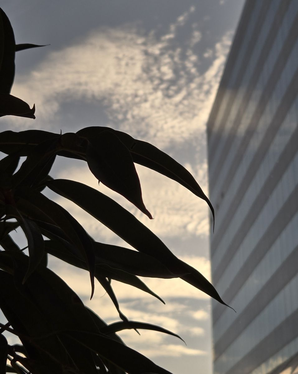 The silhouette of a tree in front of a tall office building with a sky full of clouds illuminated by the morning sun.