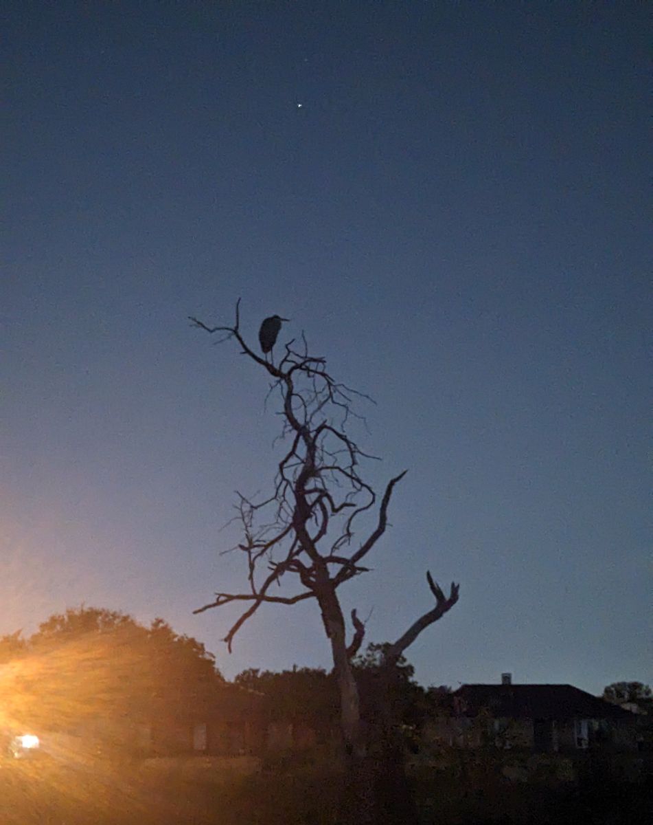 Silhouettes of a Great Blue Heron is perched atop a gnarled, dead tree under a star at night while a light shines nearby.