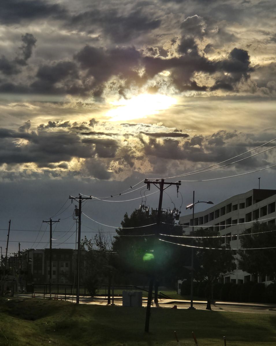 The morning sun breaking through the dark storm clouds and shining upon the street and powerlines casting the clouds into spectacular contrast.