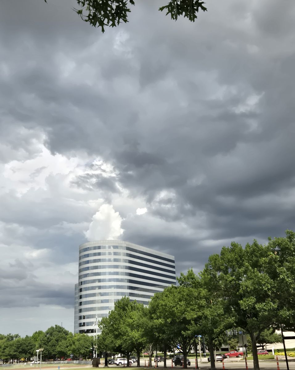 Dark storm clouds seemed to swirl ominously above a tall office building like it was the lair of a villain in a movie.