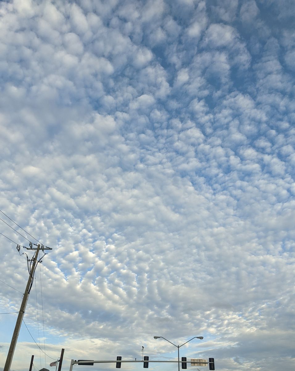 A layer of clouds that looked like shiny pearls stretching over an intersection.