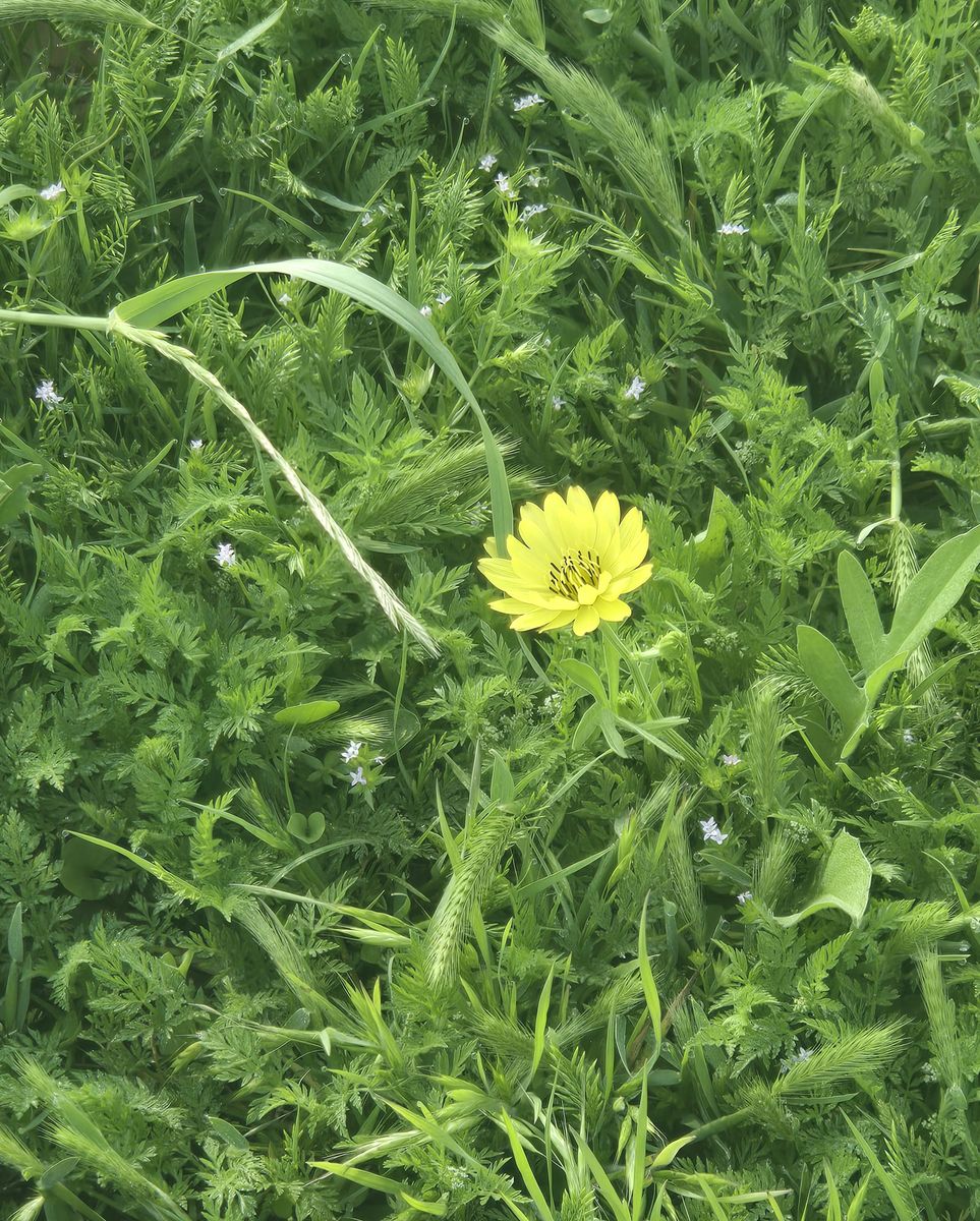 A bright yellow flower, tiny white flowers, and green grass, everything perfect and fresh with no signs of damage or decay.