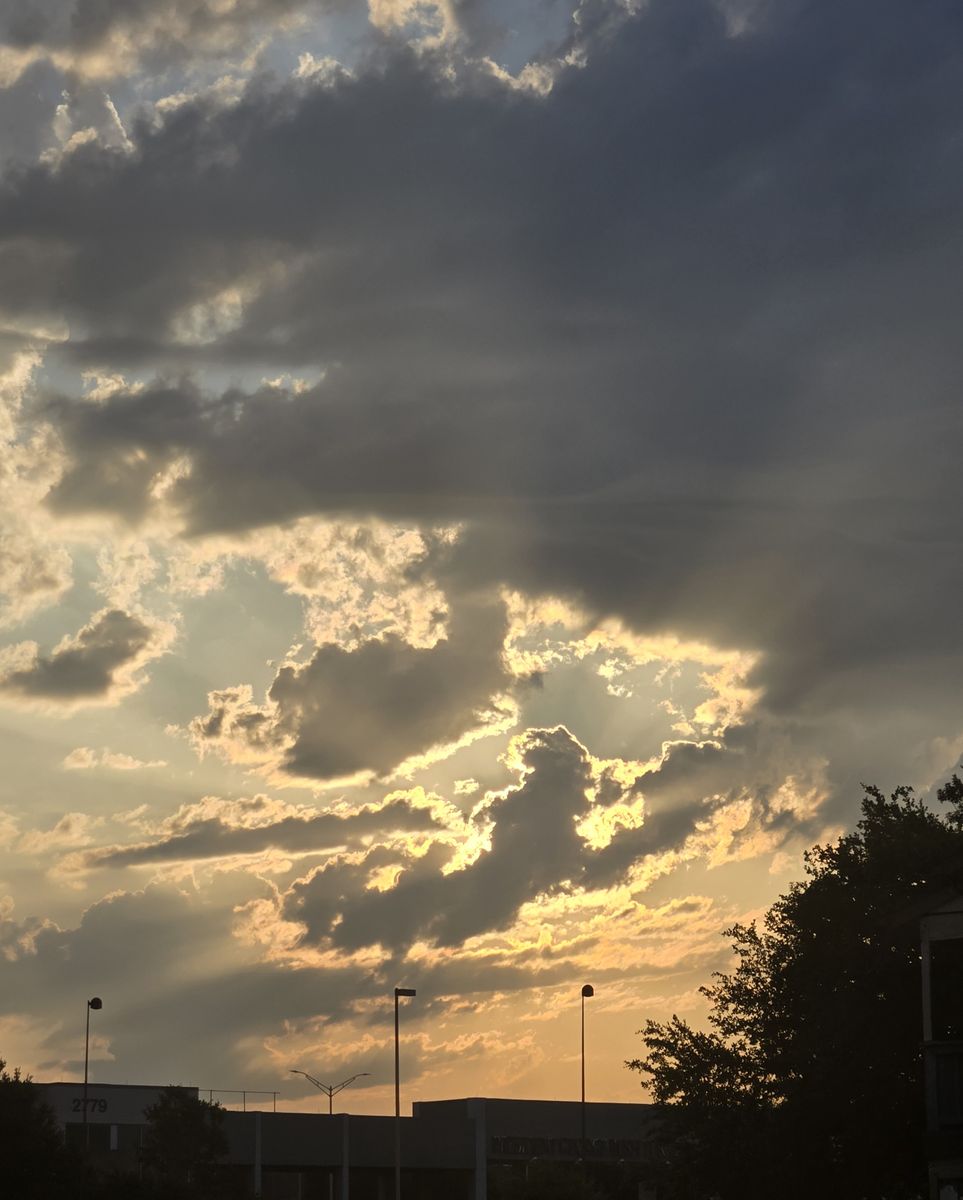 The sun shining behind clouds and creating sunbeams and gold lining on the clouds over a parking garage and trees.