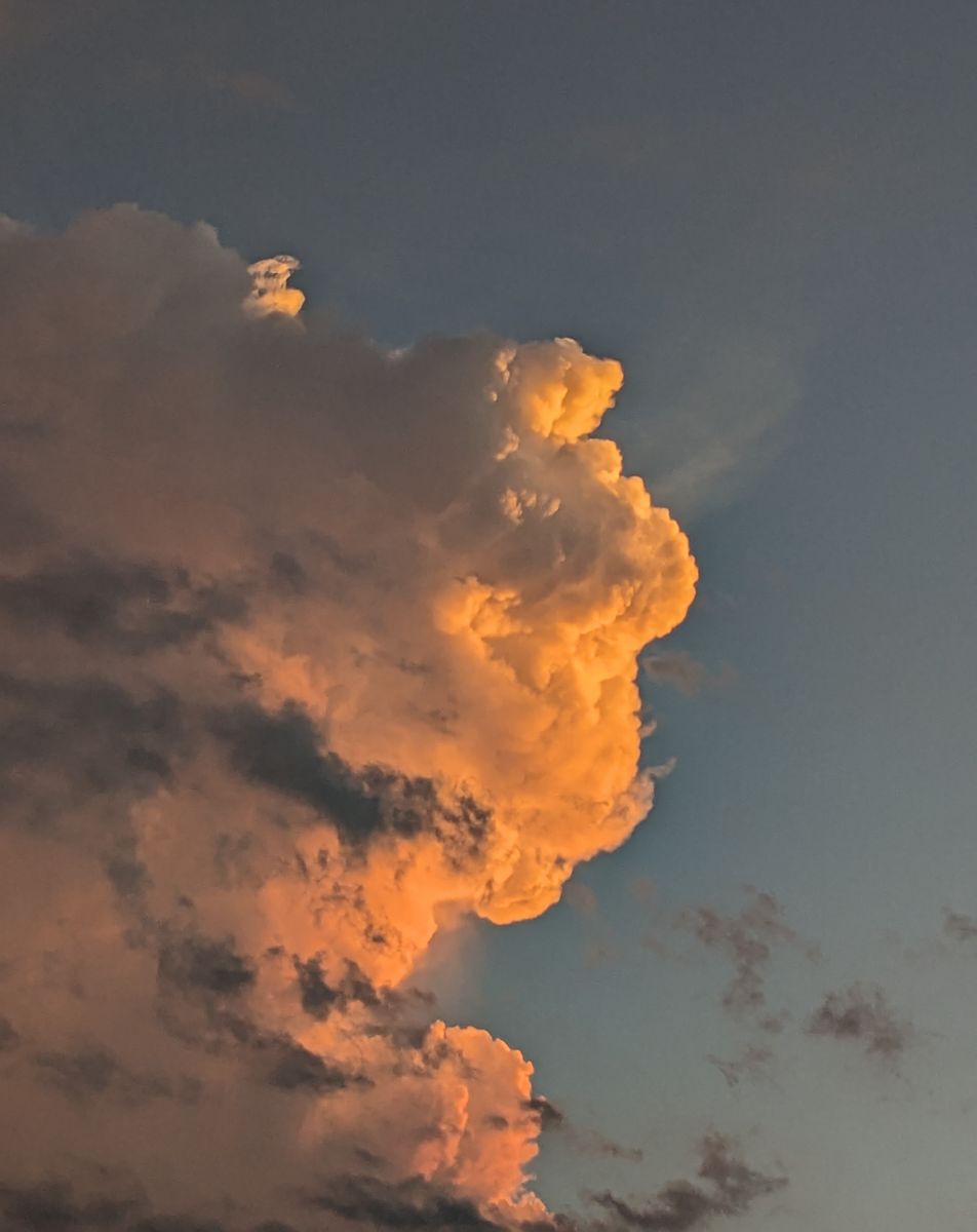 The higher clouds in the background are bright with the light from the setting sun while the lower storm clouds in the foreground are darker from rain and shadow.