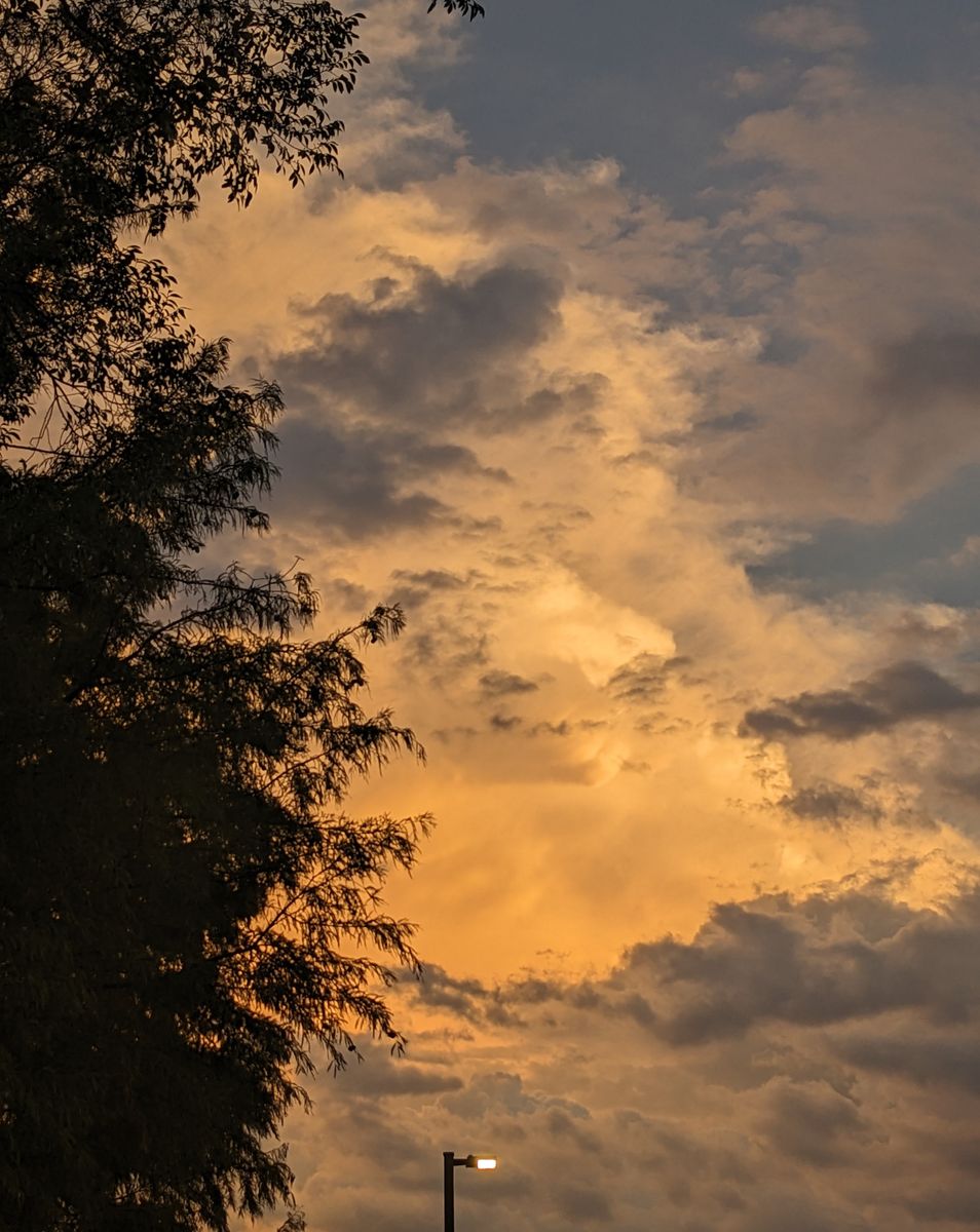 The higher clouds in the background are bright with the light from the setting sun while the lower storm clouds in the foreground are darker from rain and shadow above trees and a streetlight.