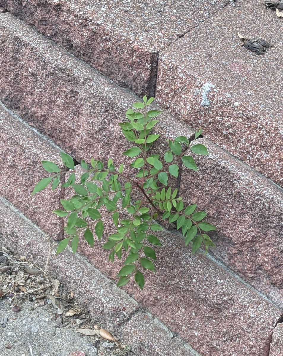 A vibrant and healthy looking plant growing through the cracks of a small brick wall.
