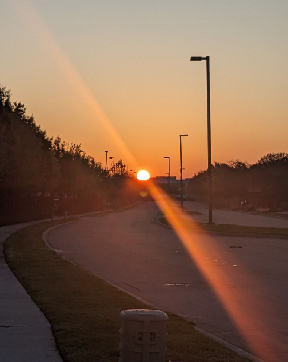 A vibrant sunrise at the end of a curving road with no traffic on it that is lined with trees and streetlights.
