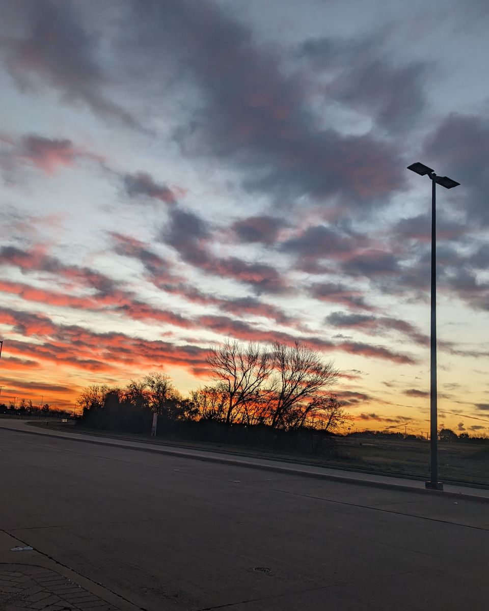 Lines of clouds in colors ranging from orange to purple from the sunrise behind the trees as seen from a road.