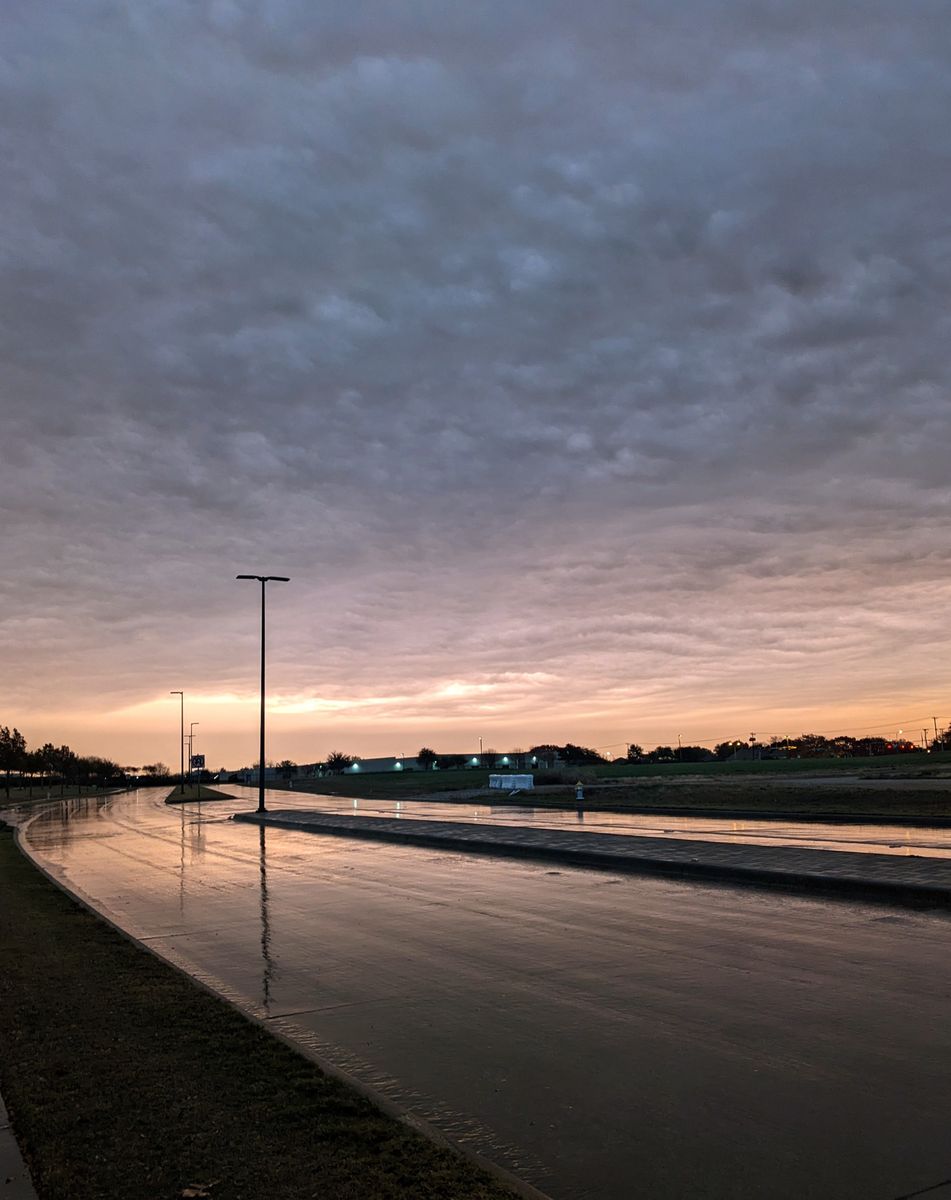 A blanket of clouds letting in the soft glow of the sunrise that is reflected on the road still wet from a rainstorm.