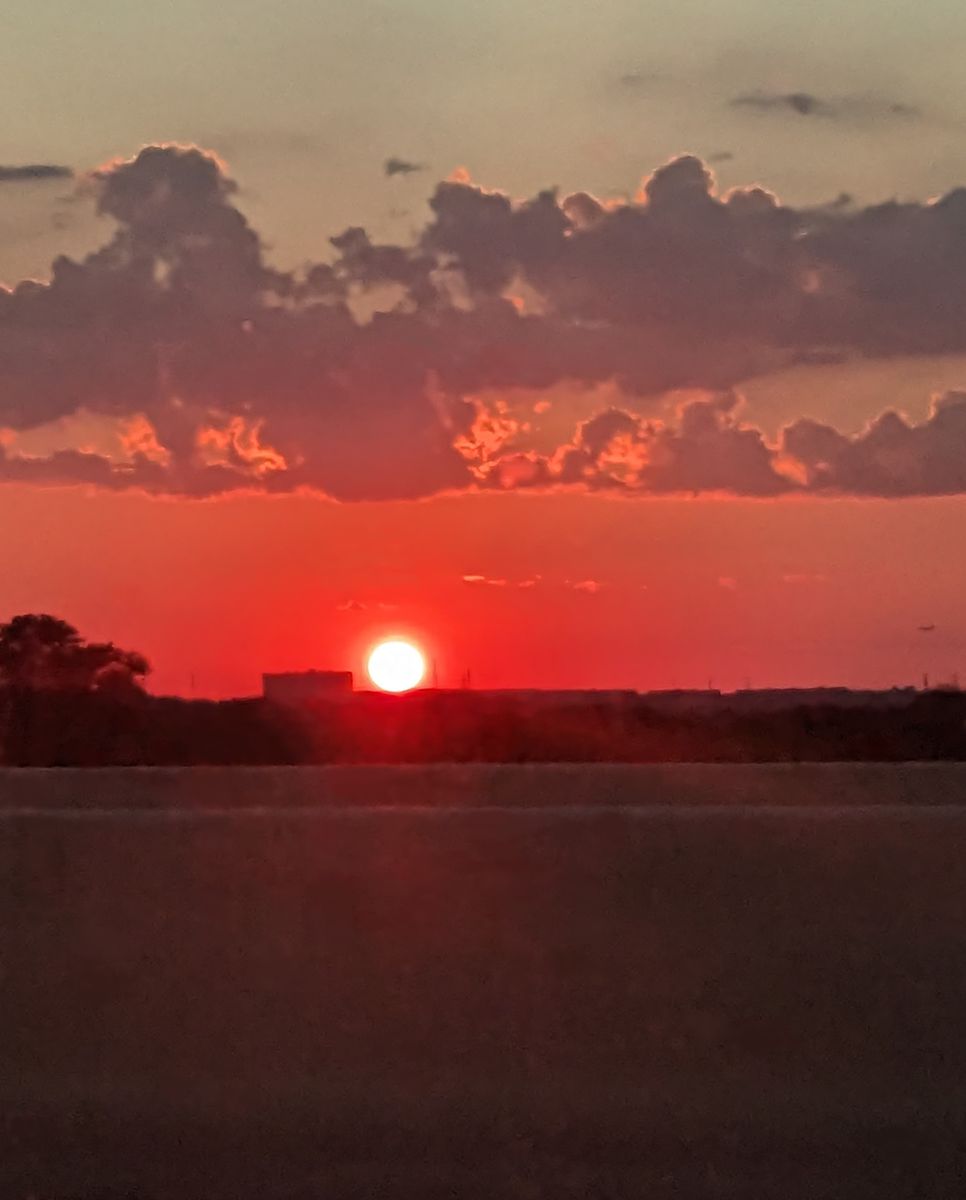 A vibrant sunset between a layer of clouds and the cityscape as seen from a road.