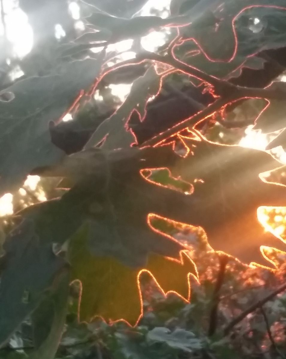 The rays from a vibrant sunset illuminating the fibers on the edges of leaves so the leaves appear to be lined with gold.