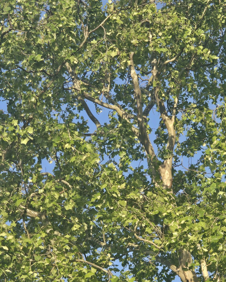 A deep, blue sky peeking through the light branches and vibrant, green leaves of a large tree.