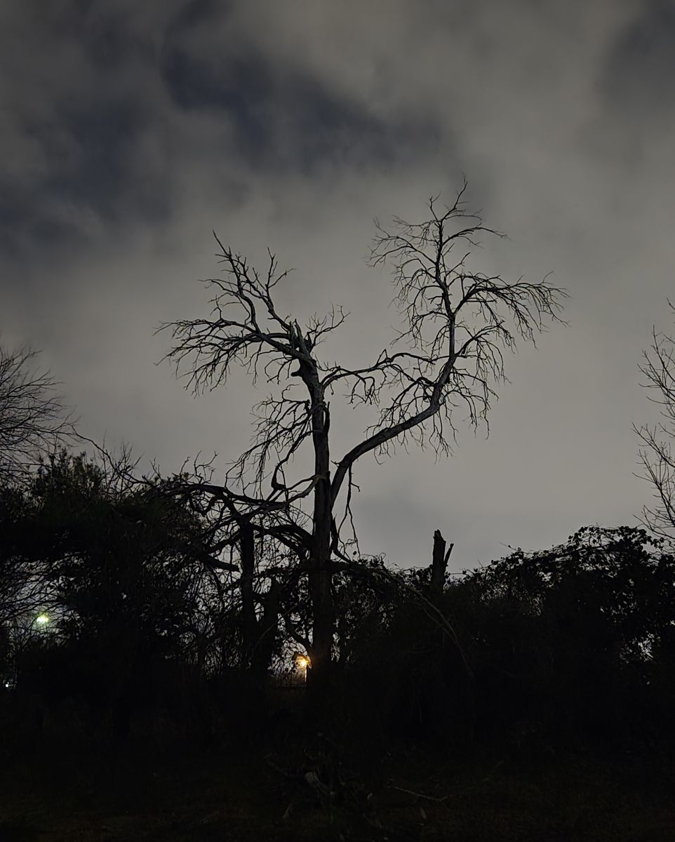 A barren tree at night under clouds that are reflecting enough residual light to turn the trees into silhouettes.