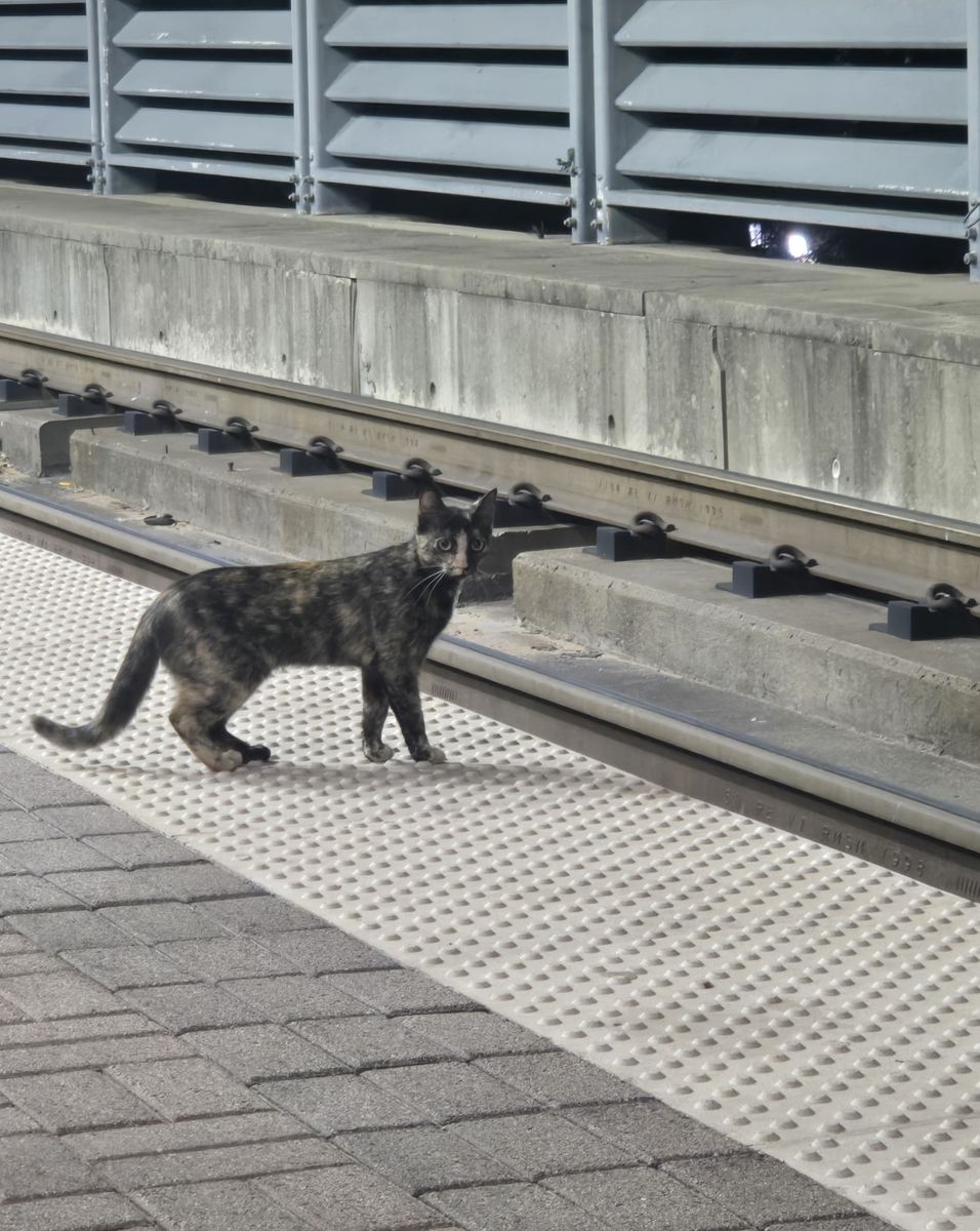 A tortoise shell cat standing on a train platform looking down the rails for an incoming train.