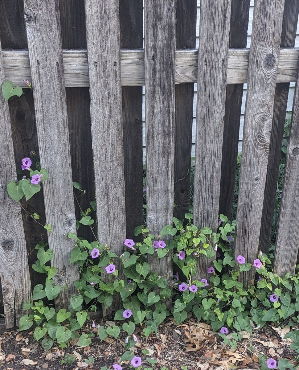 Small, purple flowers growing through the slats of a rustic, wooden fence.