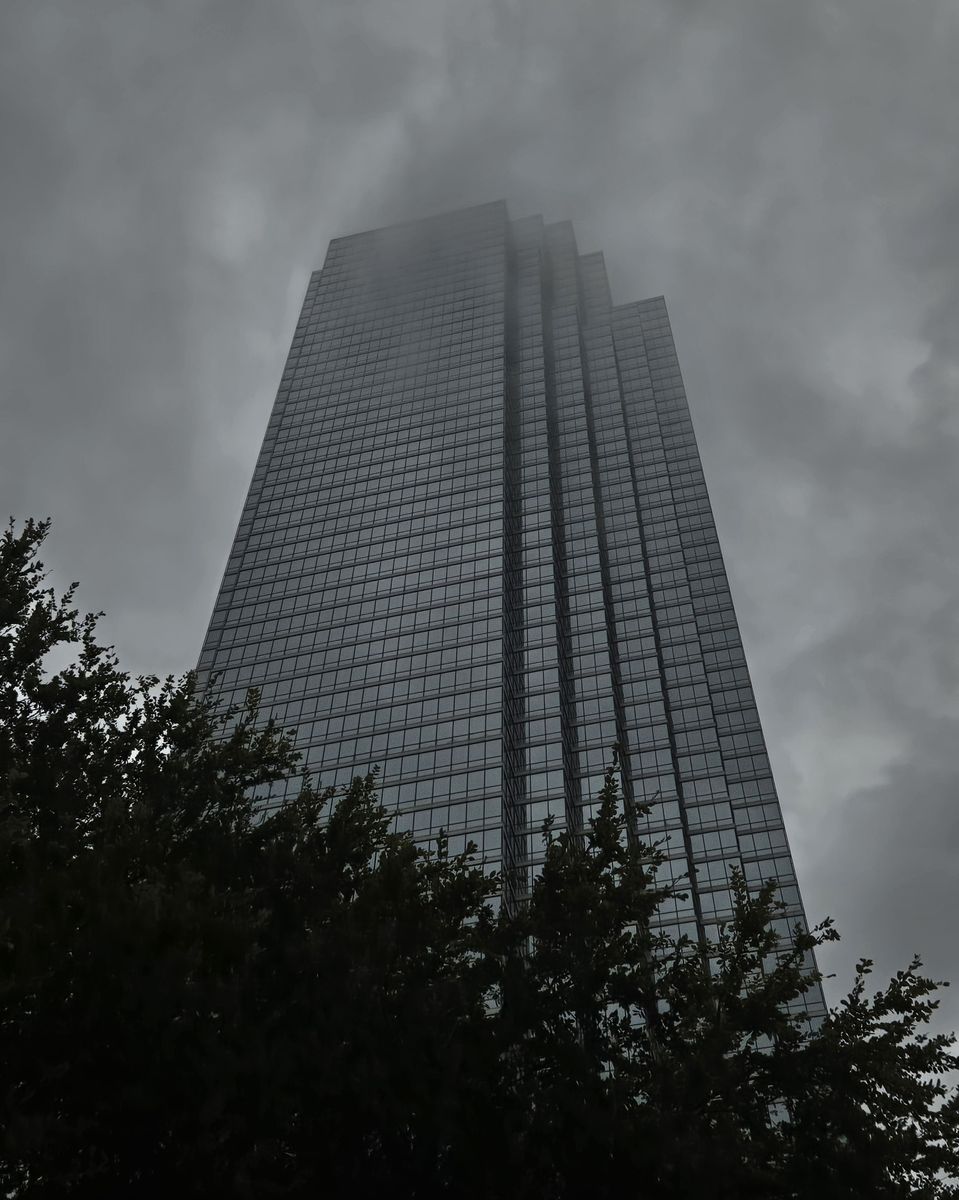 A skyscraper behind a row of trees, so tall that it is reaching into the low-hanging rainclouds.