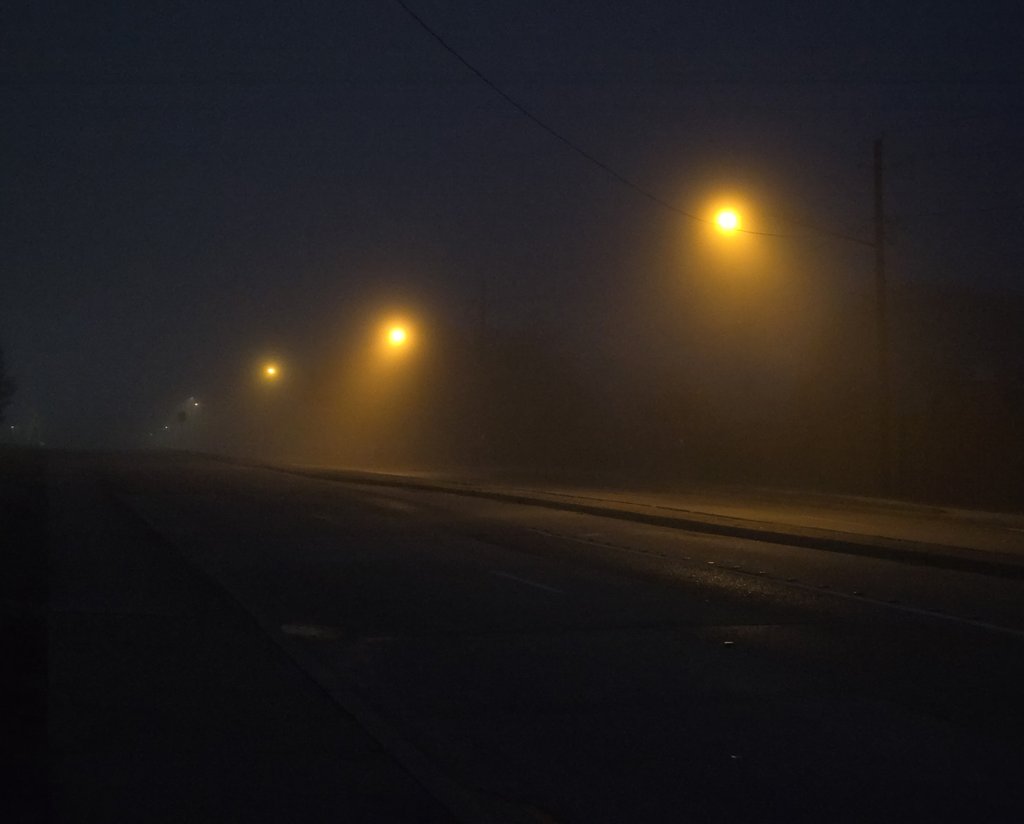 Even though dawn had broken, it was as dark as night under the dense fog covering the city. But the streetlights glowed in the mist creating an eerie feeling on the lonely street.
