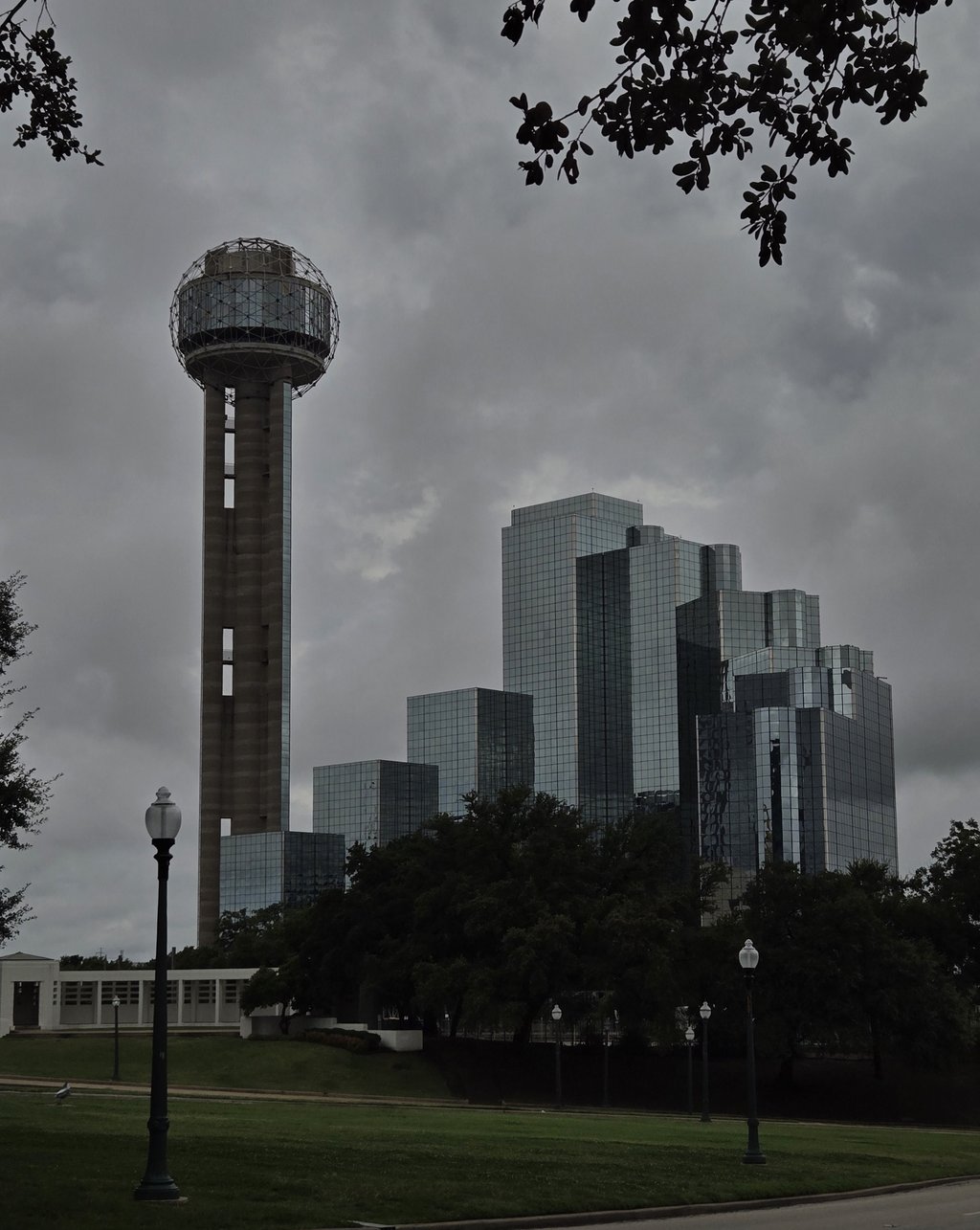 I was visiting downtown Dallas, Texas on a rainy and gloomy day. I was standing in Dealey Plaza and caught this view of Reunion Tower and the Hyatt Regency looking stunningly shiny under the dark clouds.