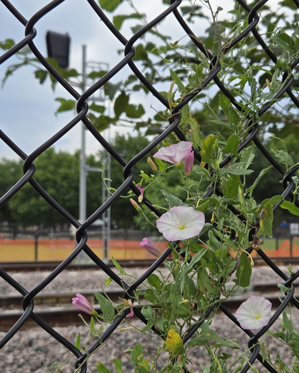The vines had grown up the chain link fence by the train station, weaving through and around the wires. One day, dozens of delicate flowers bloomed from the vines offering welcoming touches of light pink to the cold, industrial setting.