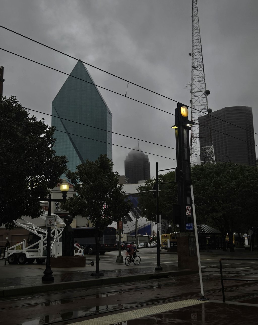 On a rainy day in late summer, downtown Dallas, Texas was bustling with life. The rain did not hinder traffic at all, and a cyclist rode past as trains and busses continued on. Pedestrians shuffled along, never minding the puddles on the ground. And streetlights glowed softly under the dark clouds.