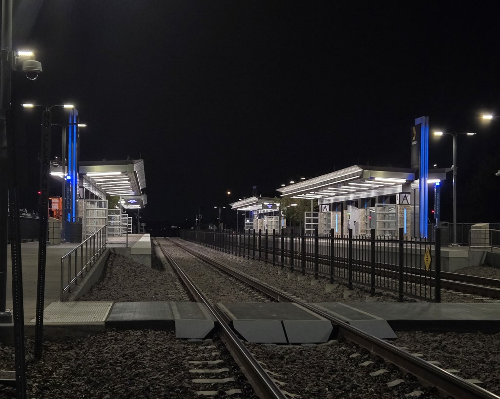 The new railway was due to open soon, and the trains had been in testing for months. All the lights were on, but the new line wasn't running yet so the station was empty. Brand new, pristine, and well lit, but not a soul around. It was eerie and beautiful, in limbo between what it was and what it will become.