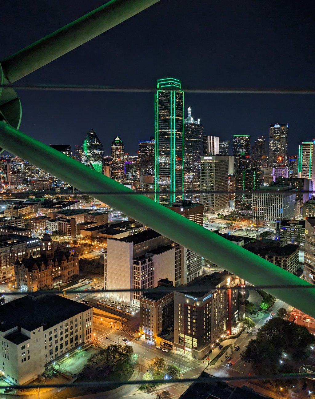 The city was bright with thousands of beautiful lights and green in mid March. The air was cool and clear and quiet as the streets were too far below to hear the traffic.