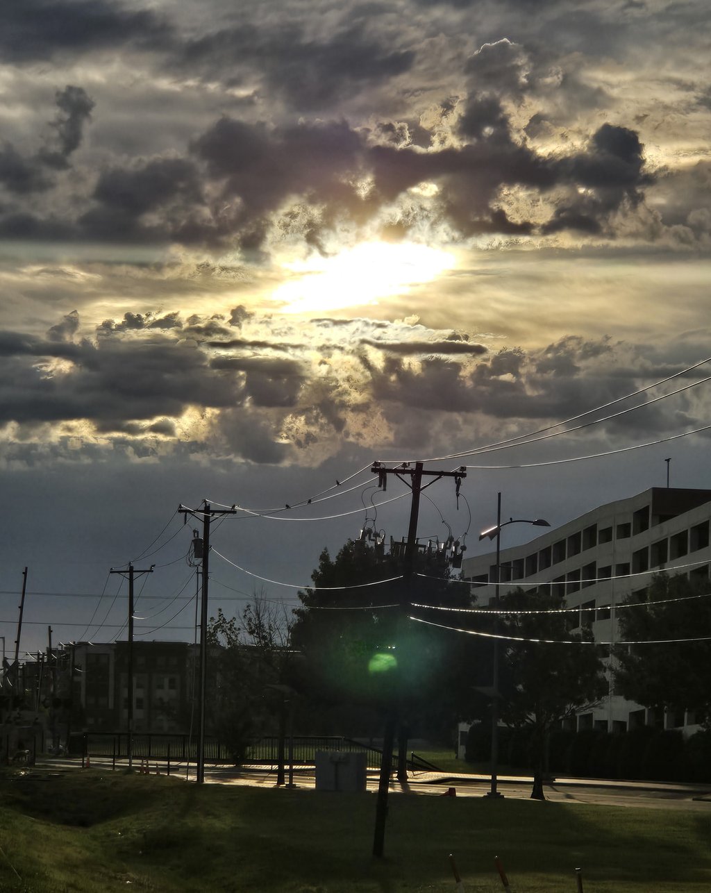 The early morning storm was just beginning to break up and the sun pushed through the dark, gloomy clouds to create dramatic, other-worldly contrast above and cause the street and power lines to shine below.