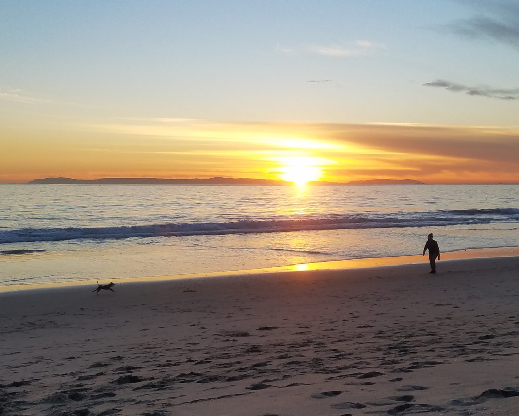 A dog and his best friend were enjoying an energetic game of fetch while the sun slowly slipped down behind Catalina Island. Light ethereal clouds hovered above as gentle raves rolled onto the shore.