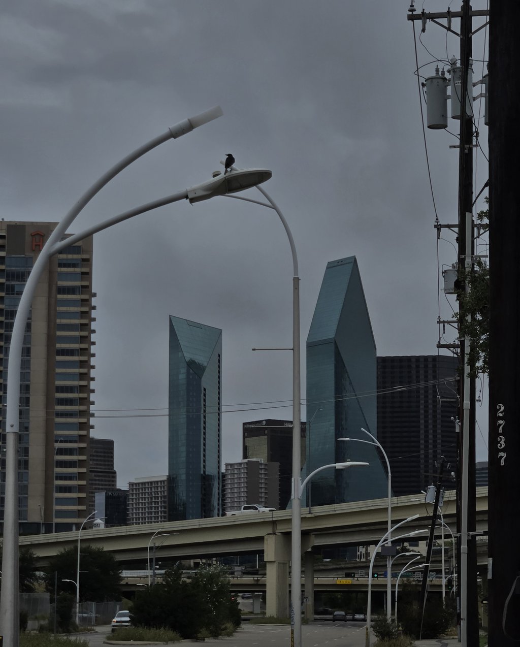 It was dark and gloomy in between bouts of rain in downtown Dallas, Texas. A solitary bird flew down and rested on a lamppost by a busy street, seeming to find the hustle below comforting.