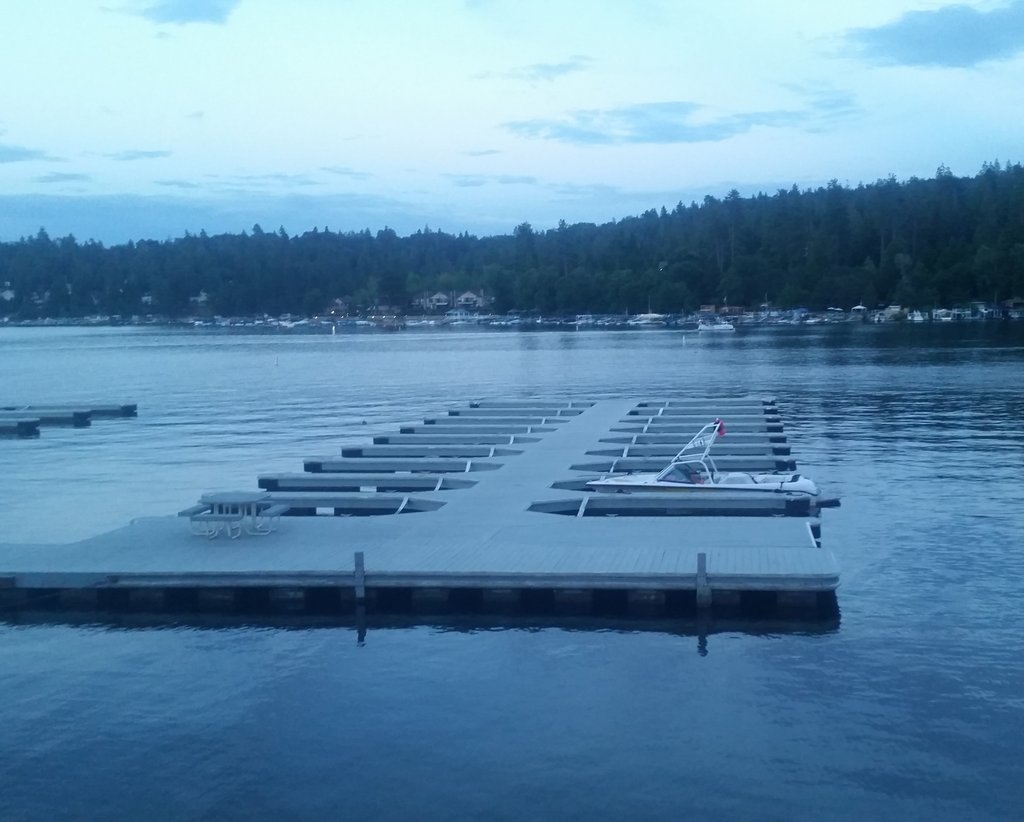 The sun had lowered behind the mountains and the lake was peaceful. On the far shore, trees stood in the shadows before the lights of the town began to shine in the evening. Most of the boats were still out on the lake while people enjoyed the rest of the daylight, but one solitary boat hadn't left the dock that day and waited for the others to return.