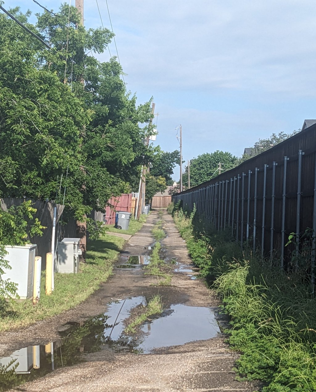 The morning sun was high over the last traces of clouds left behind by the storm. The puddles that had gathered in the alley were as still as glass reflecting images of the lush spring growth surrounding the small gravel road.