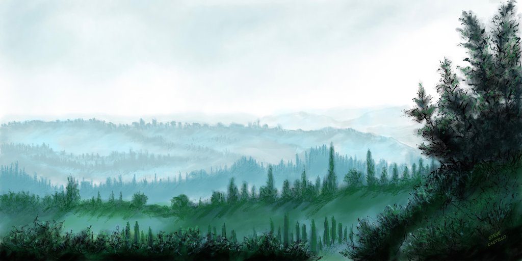 This is a digital painting created using Procreate using an I pencil. While on tour in Italy we were traveling by bus to San Gimignano. It was early morning and quite misty. The colors were absolutely beautiful so I snapped a picture from inside the bus. I loved the photo and memories with my wife Martha so I recreated it with the Procreate app.