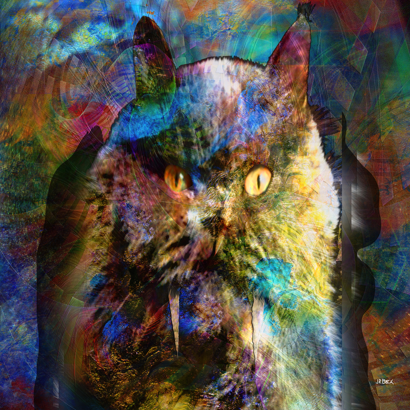 This cat art was created in 2012. It's a whimsical look at a prehistoric cat. This art also has a rectangular version. The rectangular version is not just cropped, but the art has been reworked to fit the ratio, The styles this art is offered are as follows: 1 - Prints on fine art archival matte paper attached to museum board (also known as gaterboard). The museum board is black and 3/16 inches thick. 2 - Prints on fine art archival matte paper, with a snow white mat, and elegant black frame. The print also has a glazing (acrylic glass): conservation reflection control. 3 - Prints on artisan archival canvas, thick stretched & mounted with professional taped backing & wire hanger. The canvas edge is black.