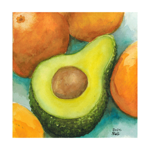 A healthy and inviting avocado surrounded by oranges, originally part of a kitchen series sold.