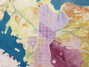 The contrast of natural and man-made objects creates a colorful palette for this aerial landscape view of a solar farm with a river running through it.