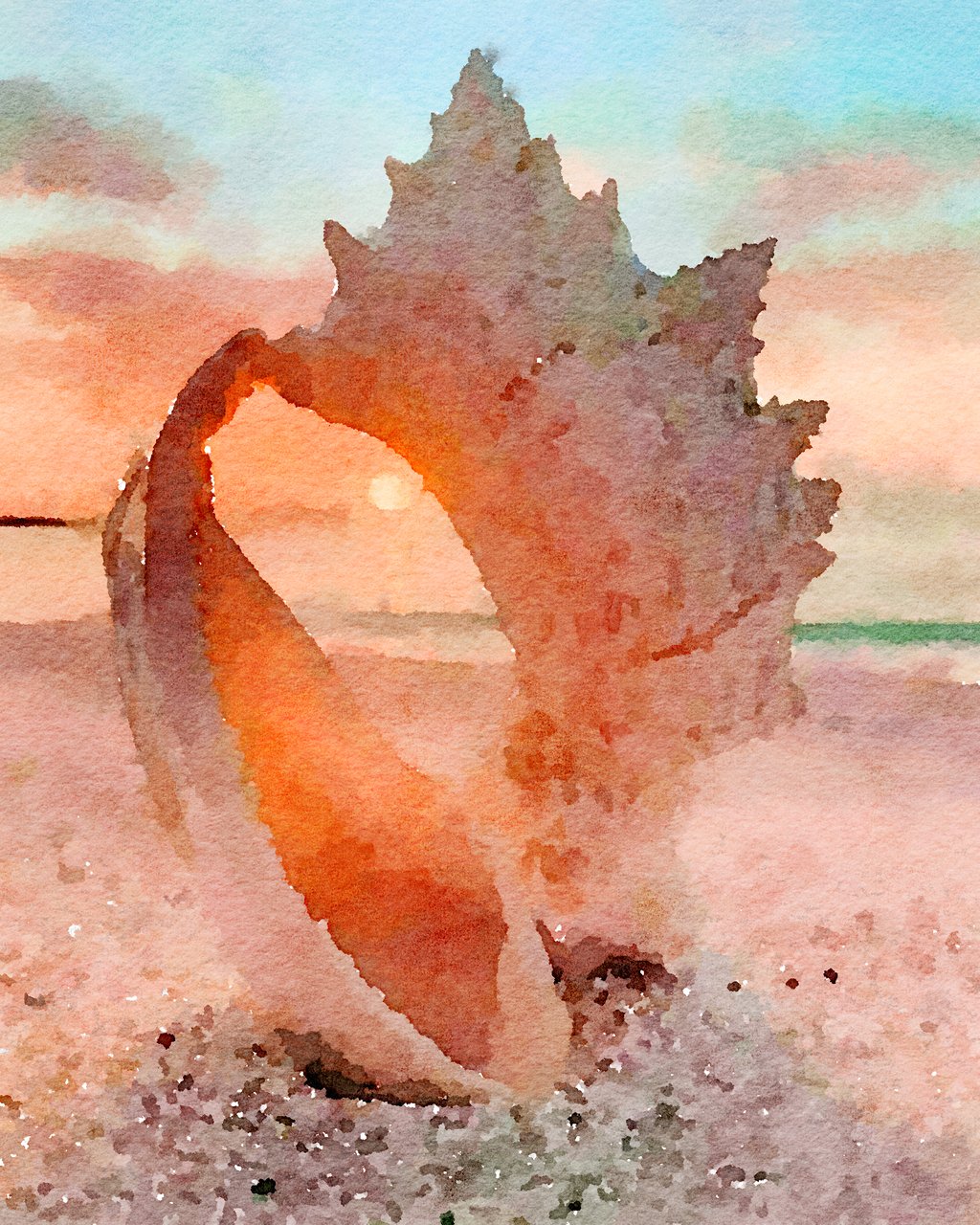 A beautiful shell rests on the soft, sun-kissed sand, its spiral shape catching the light. The calm ocean waves lap softly in the background, creating a serene and timeless scene.
