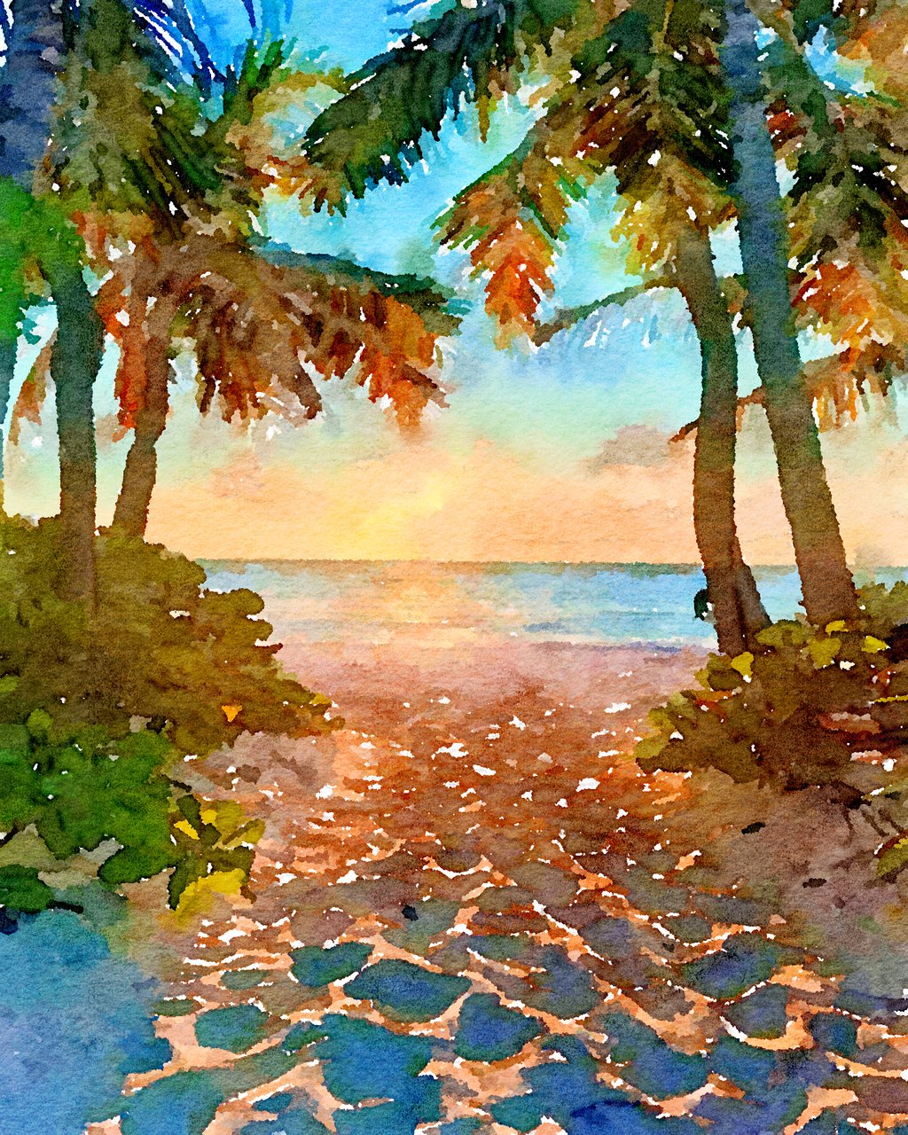 Beautiful day at the beach!! This painting of a coastal setting feels peaceful and expansive. Tall, graceful palm trees frame the scene. The sand appears almost luminous, reflecting the bright sunlight as it meets the edge of the calm, shimmering ocean.