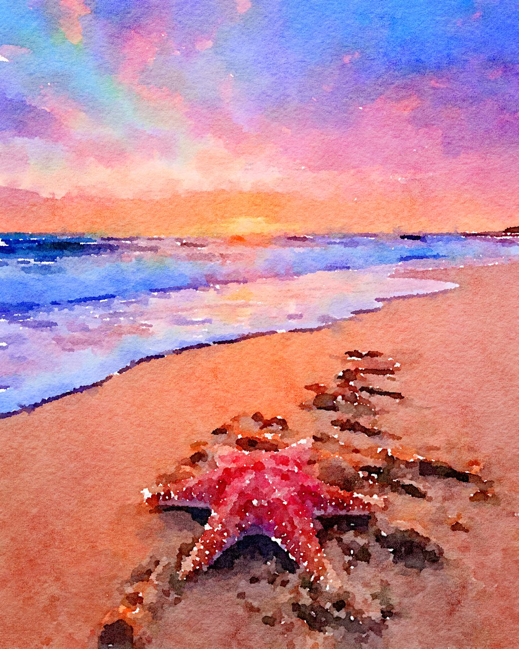 A starfish rests on the warm sand, its arms splayed out in perfect symmetry. The starfish seems to glow against the fading light, a quiet, beautiful reminder of the ocean’s mysteries.