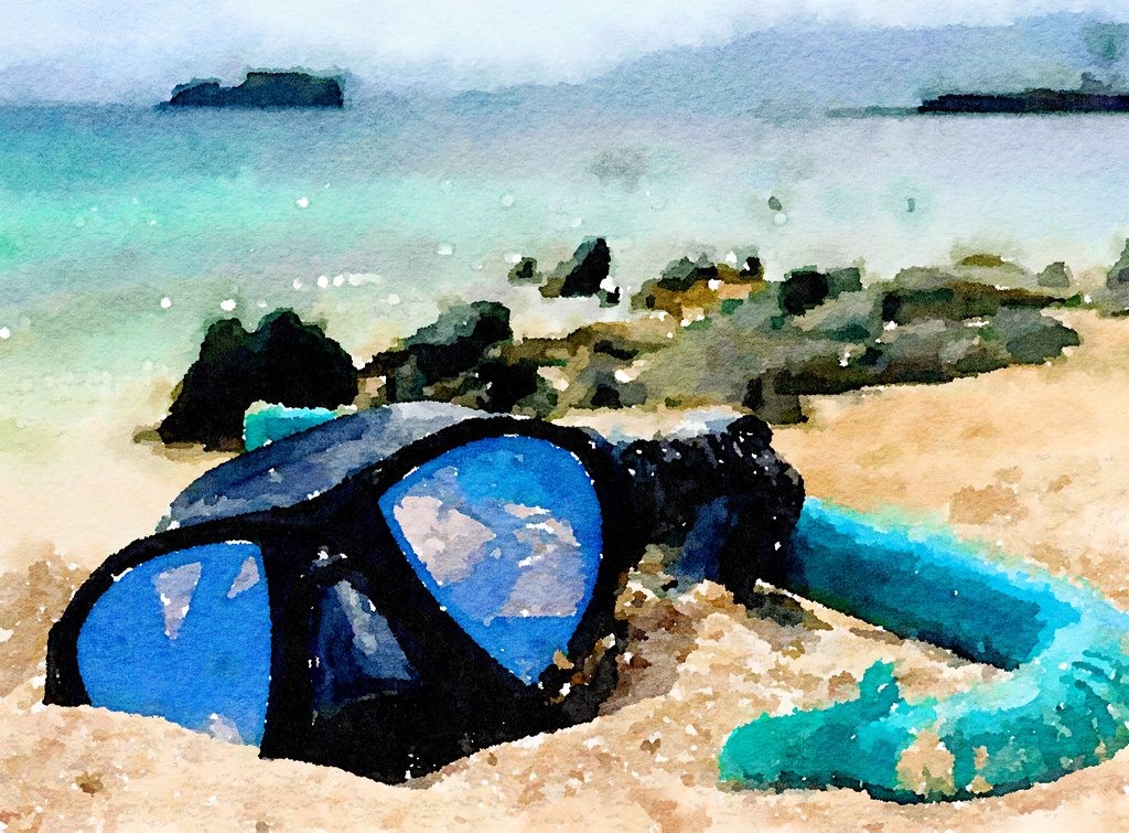 Bright, playful washes of color suggest sunlight dancing across the shoreline, while the gear lies casually in the warm sand, still glistening with hints of ocean water. Soft turquoise and coral hues echo the lively underwater world just explored, giving the scene a cheerful, carefree feeling.