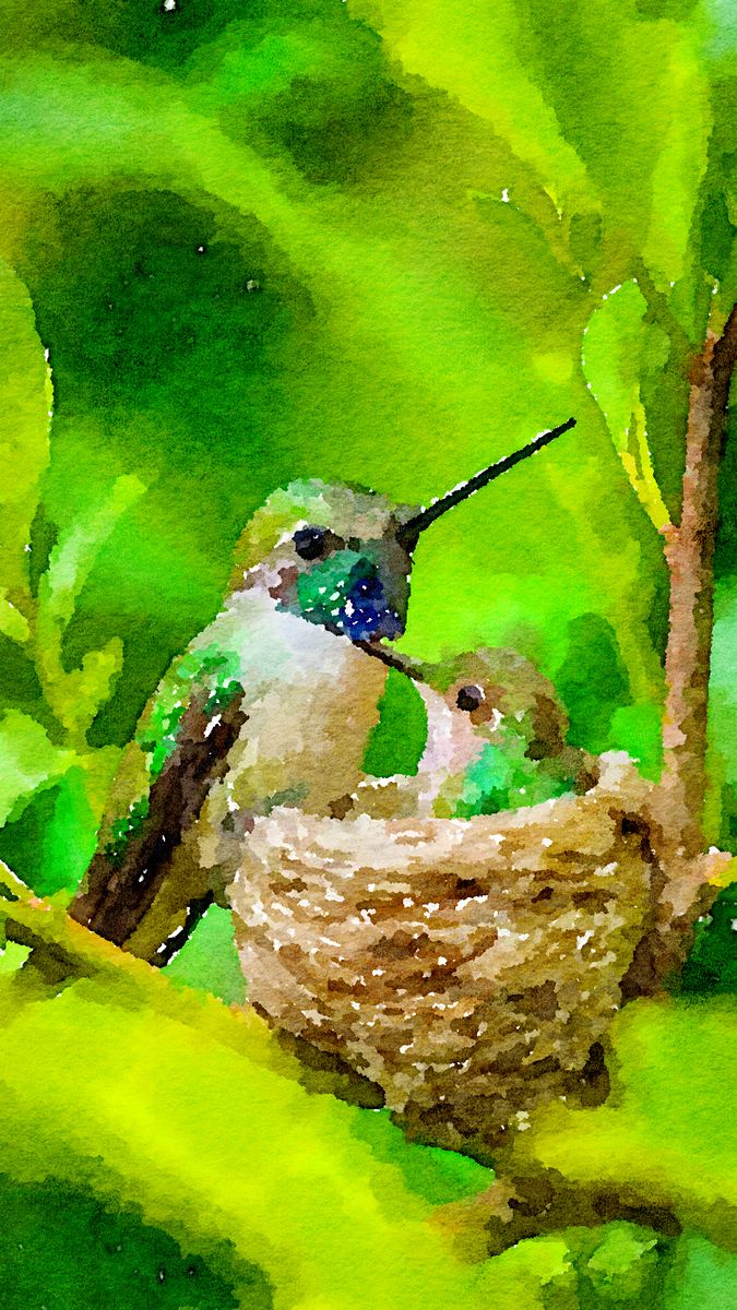 A mother hummingbird flutters gracefully beside her tiny baby. Together they share the delicate rhythm of the garden, a perfect blend of grace and care.