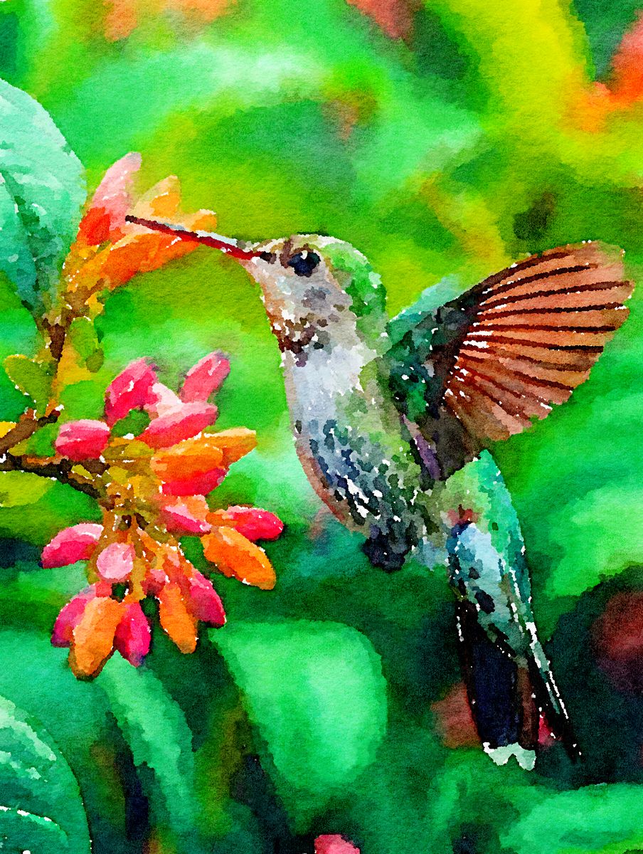 A hummingbird hovers in front of a flower. While its tiny body moves gracefully from blossom to blossom, a blur of color and life.
