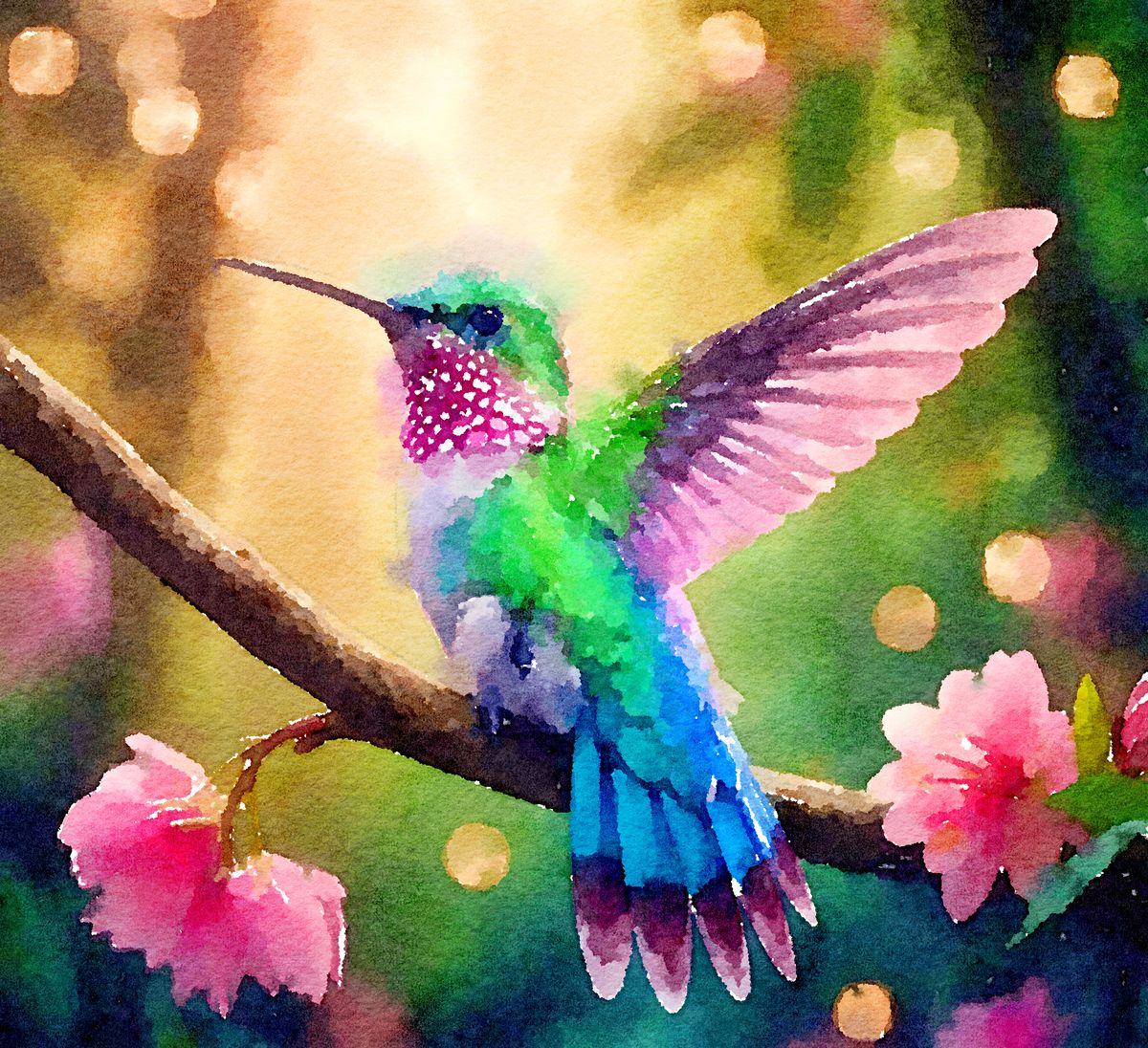 A vibrant hummingbird perches delicately on a tree limb, its tiny body gleaming with an array of brilliant colors.